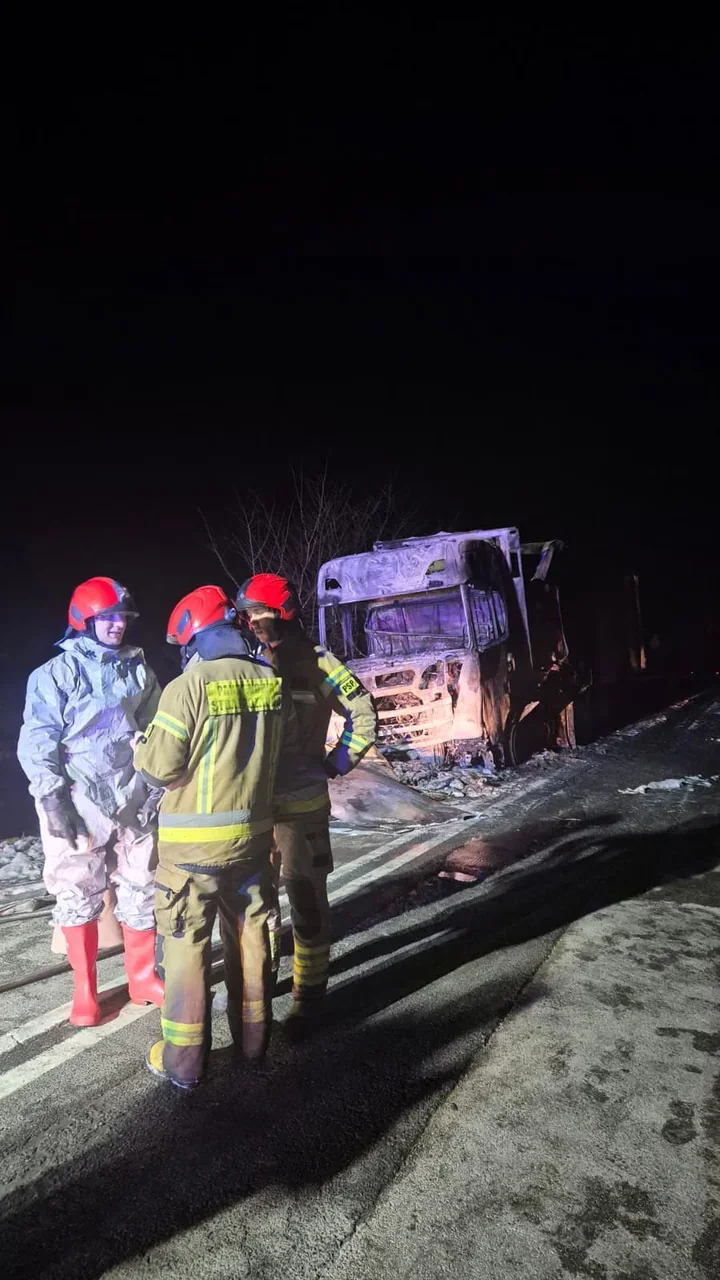 Mazurska stanęła po pożarze ciężarówki z naczepą