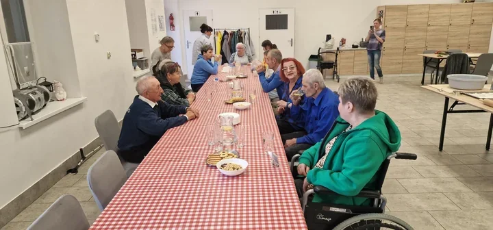 Przy stolnicy pojawiło się łącznie 18 osób. W pracę włączyły się panie z Koła Gospodyń Wiejskich „Łęczowianki”, mieszkańcy DPS Tolkmicko oraz uczestnicy WTZ w Tolkmicku wraz z opiekunami. Jedni skupiali się na zagniataniu ciasta, inni na lepieniu równych brzegów, ktoś doglądał farszu, a ktoś po prostu patrzył z uwagą, jak z prostych składników rodzi się porządny domowy posiłek. Właśnie w takich chwilach najlepiej widać, że wspólna robota potrafi spiąć ludzi mocniej niż niejedna oficjalna uroczystość.