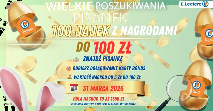 W sklepie E.Leclerc w Elblągu pisanki chowają się między półkami — można trafić na doładowanie na kartę Bonus o wartości od 5 do 100 zł. Wpadnij na zakupy i spróbuj szczęścia!